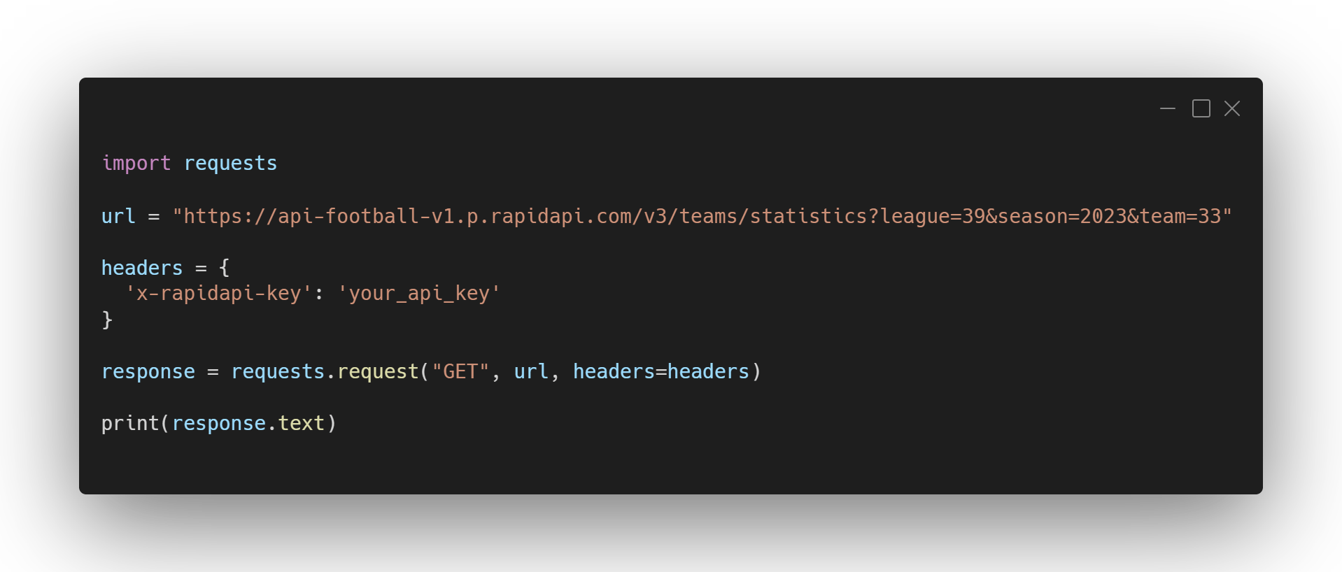 With your subscription in place, you can now send requests to the API and retrieve the data you need. Below is a sample request to get all statistics for Manchester United in the 2023 season. Be sure to replace "your_api_key" with your actual RapidAPI key.